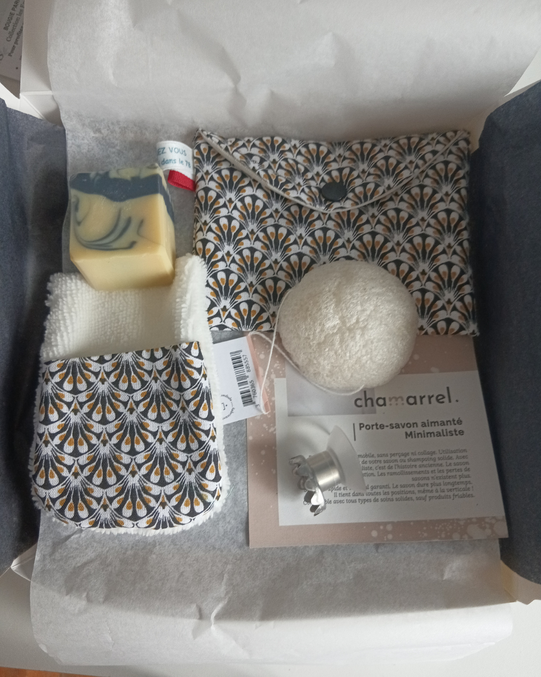 Un coffret aux notes profondes de patchouli réunissant un savon au charbon actif, des accessoires essentiels pour le soin et des matières naturelles pour une routine simple et fonctionnelle.