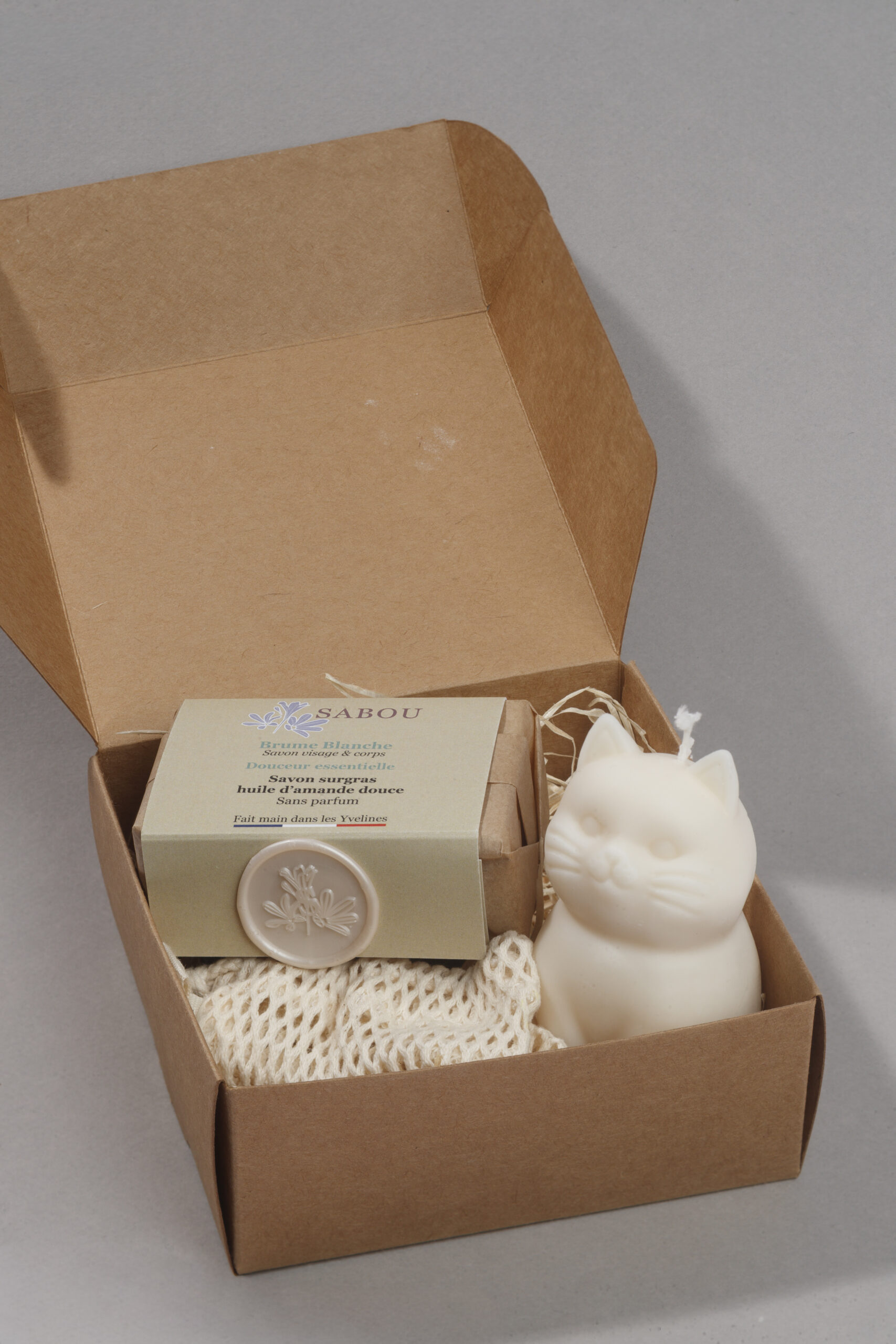 Savon ultra-doux, bougie en cire de colza sans OGM, ni pesticide, sans parfum et pochette sauve savon : une invitation à prendre soin de soi avec simplicité et élégance.