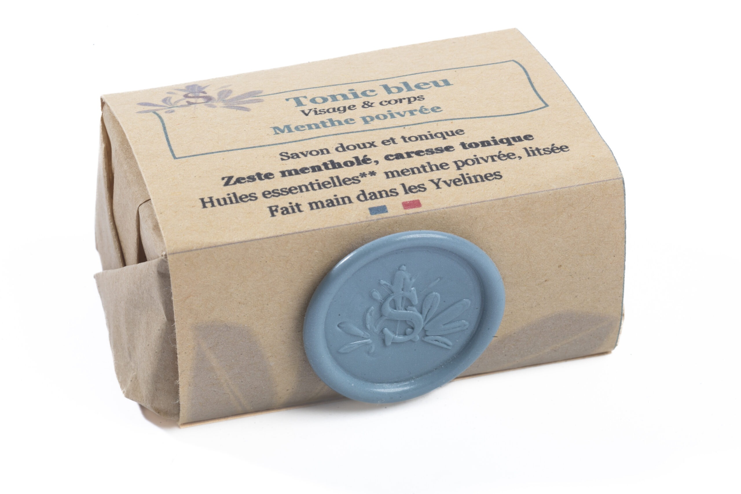 Huile d’olive du Moulin de la Garrigue, huile de colza bio du Moulin de Launay, beurre de coco bio, beurre de karité bio, huiles essentielles bio de menthe poivrée, litsée citronnée, cèdre de l’Atlas. Coloré avec l’Indigo et le bleu maya, créés par le Champs des Couleurs, cultivés en agriculture biologique.